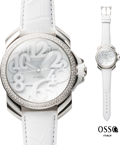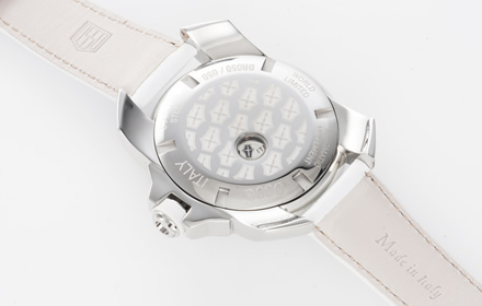 裏蓋の小窓からはムーブメントに施されたOSSO ITALYのブランドロゴが見え、ナンバリングとクロスモチーフのロゴが刻まれている。