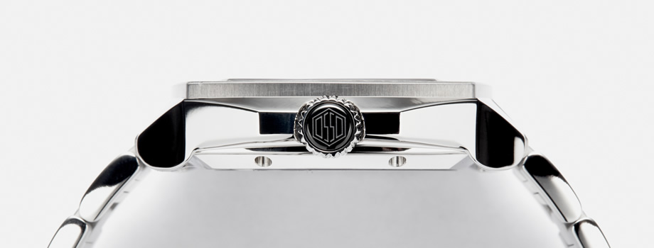 セヴェロとはイタリア語で「厳格」「重厚」を意味し端正な雰囲気の スクエアケースがドレッシーでラグジュアリー感を醸し出します。 スイス製ムーブメント搭載自動巻き 5気圧防水 ステンレススチールブレス サファイアガラス ケース厚さ11mm 直径44mm×44mm シリアルナンバー入り ダブルロック採用